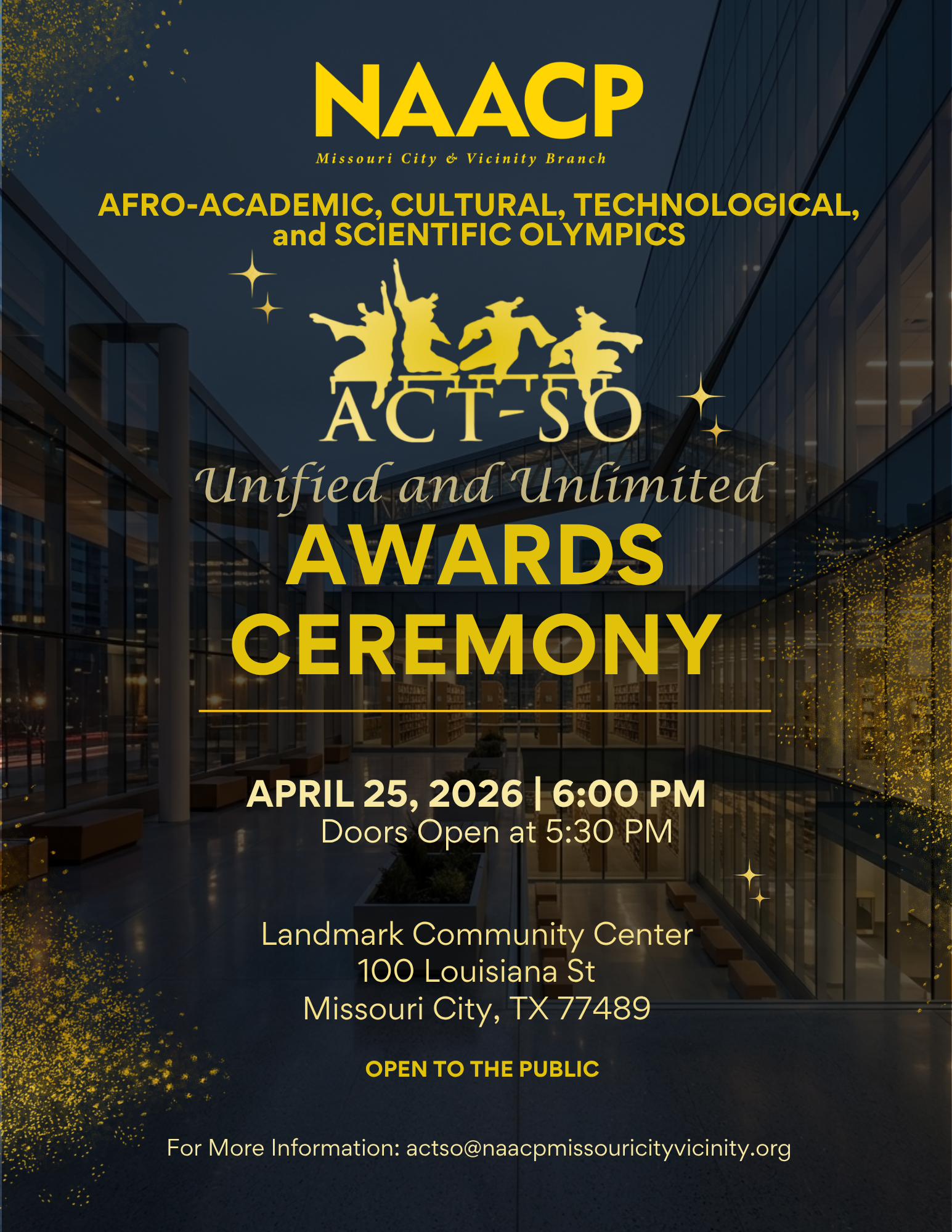 The Missouri City & Vicinity Branch of the NAACP invites the public to the ACT-SO (Afro-Academic, Cultural, Technological, and Scientific Olympics) Unified and Unlimited Awards Ceremony. This event celebrates the achievements of talented youth in various academic and artistic categories.