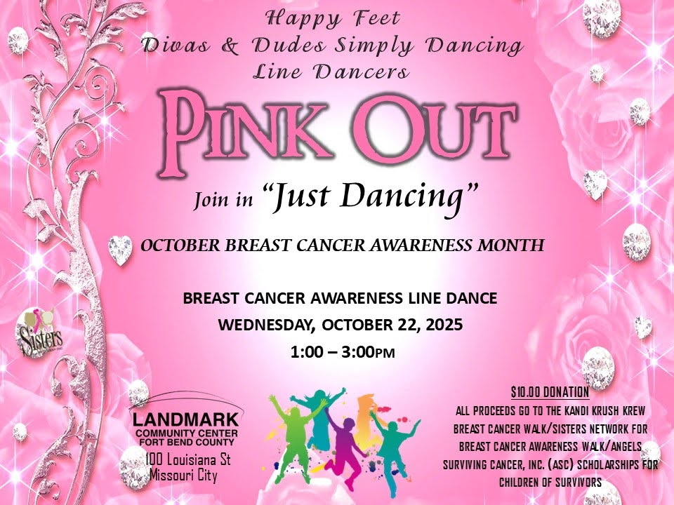 Wednesday, October 22, 2025, 1:00 - 3:00 pm, come to enjoy an extended line dancing class to Pink Out and celebrate breast cancer survivors and bring awareness to your own health.